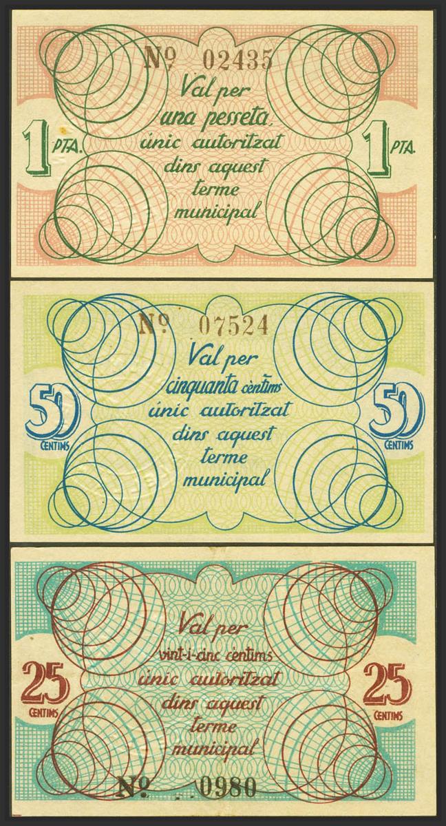 ALELLA (BARCELONA). 25 Céntimos, 50 Céntimos y 1 Peseta. (1937ca). (González: 6158/60). Serie completa. SC-/EBC+.