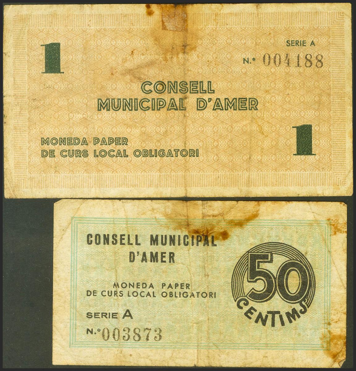AMER (GERONA). 50 Céntimos y 1 Peseta. 1 de Mayo de 1937. Serie A, ambos. (González: 6246/47). Serie completa. BC.