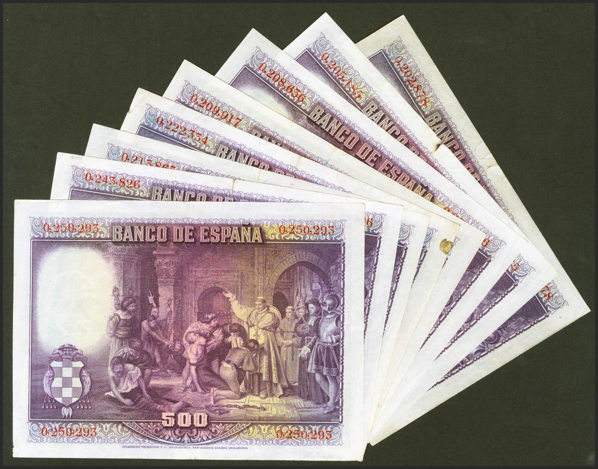 Conjunto de 8 billetes de 500 Pesetas emitidos el 15 de Agosto de 1928, sin serie y todos ellos con numeraciones bajas (Edifil 2021: 356), conserva gran parte de su apresto original. EBC/MBC. A EXAMINAR.