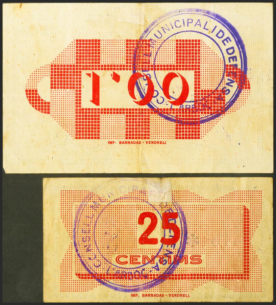 L´ARBOÇ (TARRAGONA). 25 Céntimos y 1 Peseta. Mayo 1937. (González: 6314, 6316). MBC.