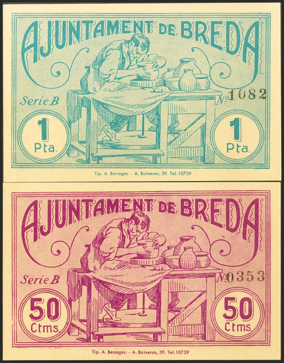 BREDA (GERONA). 50 Céntimos y 1 Peseta. 11 de Mayo de 1937. Serie B, ambos. (González: 7202/03). Inusual serie completa. SC-.