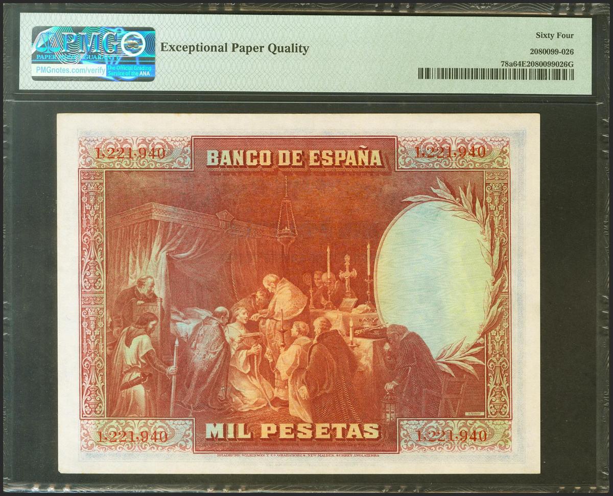 1000 Pesetas. 15 de Agosto de 1928. Sin serie. (Edifil 2021: 357, Pick: 78a). Inusual en esta excepcional calidad, apresto original. SC. Encapsulado PMG64EPQ.