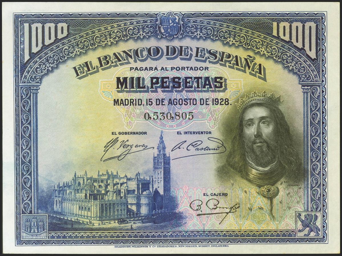1000 Pesetas. 15 de Agosto de 1928. Sin serie. (Edifil 2021: 357, Pick: 78a). Conserva todo su apresto original. SC-.