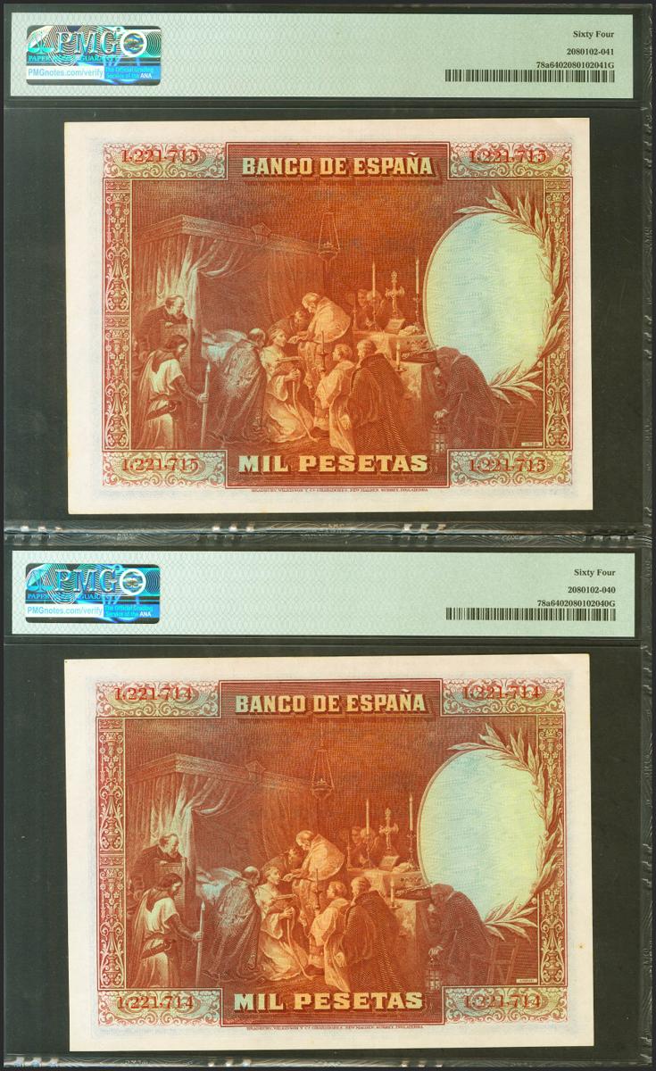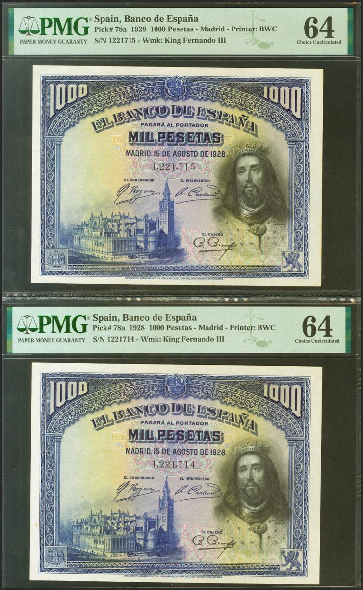 1000 Pesetas. 15 de Agosto de 1928. Pareja correlativa. Sin serie. (Edifil 2021: 357, Pick: 78a). Inusual en esta calidad. SC. Encapsulado PMG64, ambos.