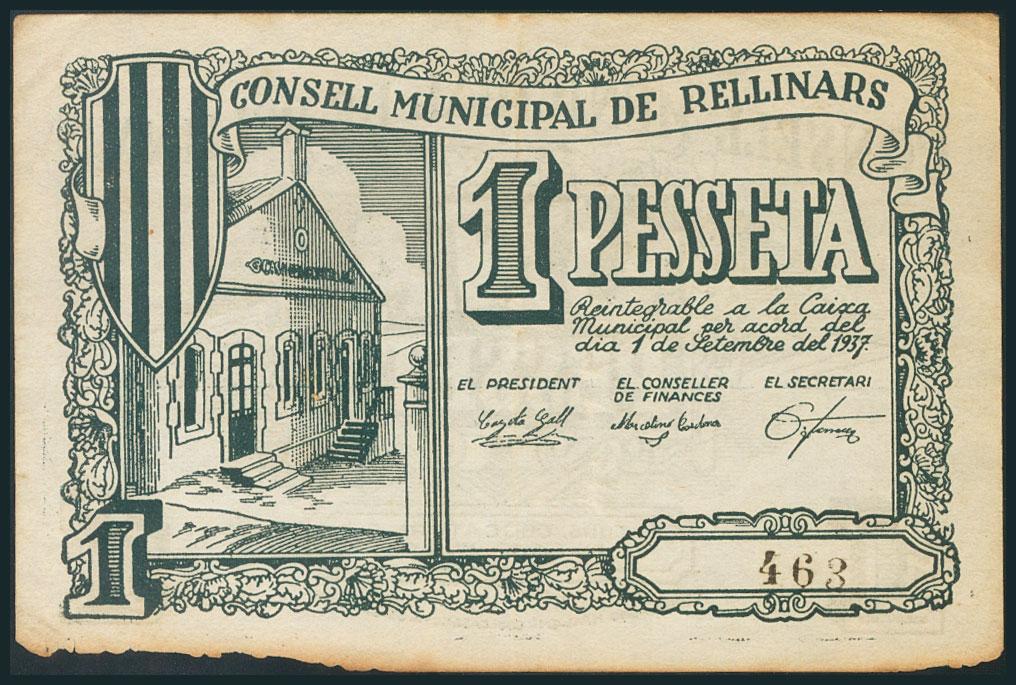 RELLINARS (BARCELONA). 1 Peseta. 1 de Septiembre de 1937. (González: 9546). Muy raro. MBC.