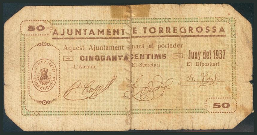 TORREGROSSA (LERIDA). 50 Céntimos. Junio 1937. Serie A. (González: 10361). Muy raro, billete cosido. RC.