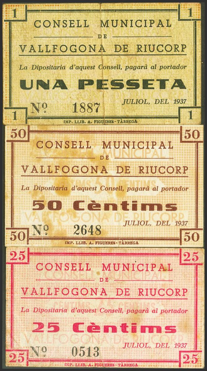 VALLFOGONA DE RIUCORP (TARRAGONA). 25 Céntimos, 50 Céntimos y 1 Peseta. Julio 1937. (González: 10516, 10517, 10518). Inusuales. MBC/MBC-.