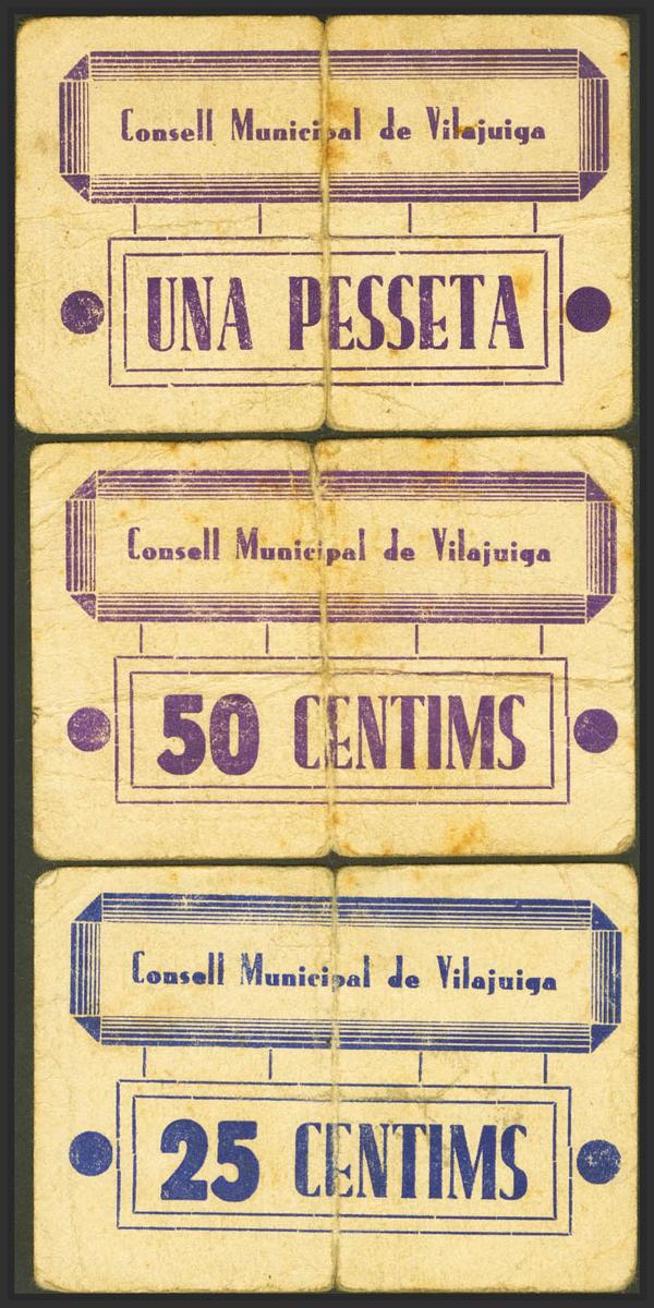 VILAJUIGA (GERONA). 25 Céntimos, 50 Céntimos y 1 Peseta. (1937ca). (González: 10735/37). Muy rara serie completa. BC-.
