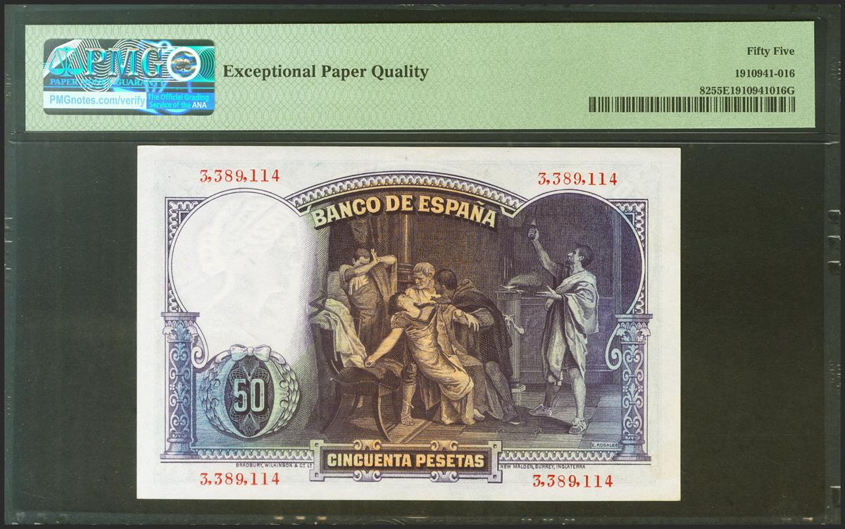 50 Pesetas. 25 de Abril de 1931. Sin serie. (Edifil 2021: 359, Pick: 82). Apresto original. EBC+. Encapsulado PMG55EPQ.