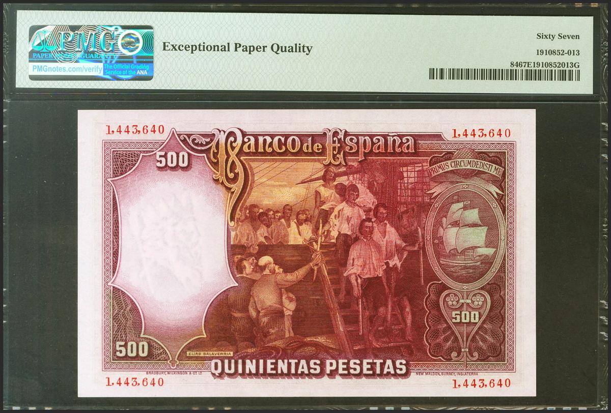 500 Pesetas. 25 de Abril de 1931. Sin serie. (Edifil 2021: 361, Pick: 84). Rarísimo en esta excepcional calidad, apresto original. SC. Encapsulado PMG67EPQ.