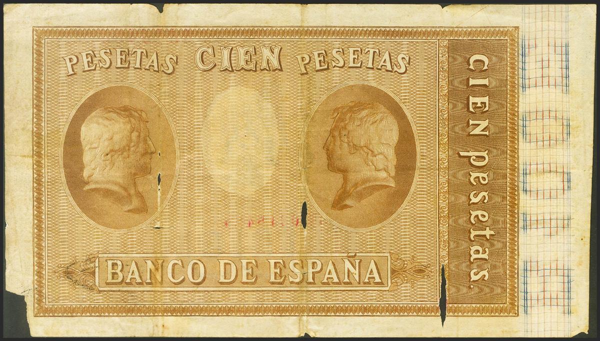 100 Pesetas. 24 de Julio de 1893. Sin serie. (Edifil 2021: 302, Pick: 44). Raro sin ninguna reparacion, roturitas y falta de papel. MBC.