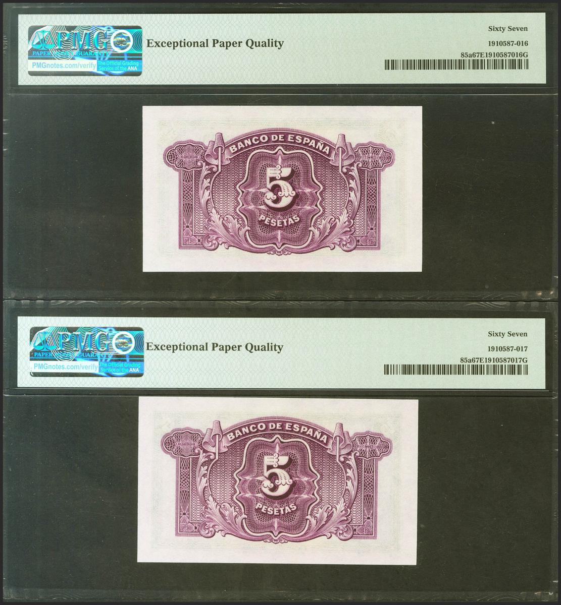 5 Pesetas. 1935. Certificado de Plata. Pareja correlativa. Serie K. (Edifil 2017: 363b, Pick: 85a). Raro en esta excepcional calidad, apresto original. Encapsulado PMG67EPQ, ambos.