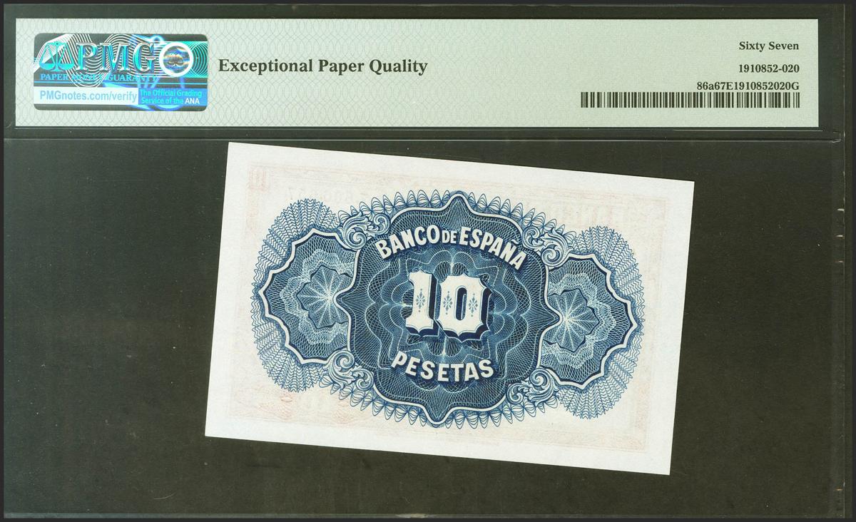 10 Pesetas. 1935. Sin serie. (Edifil 2021: 364, Pick: 86). Muy raro en esta excepcional calidad, apresto original. SC. Encapsulado PMG67EPQ.