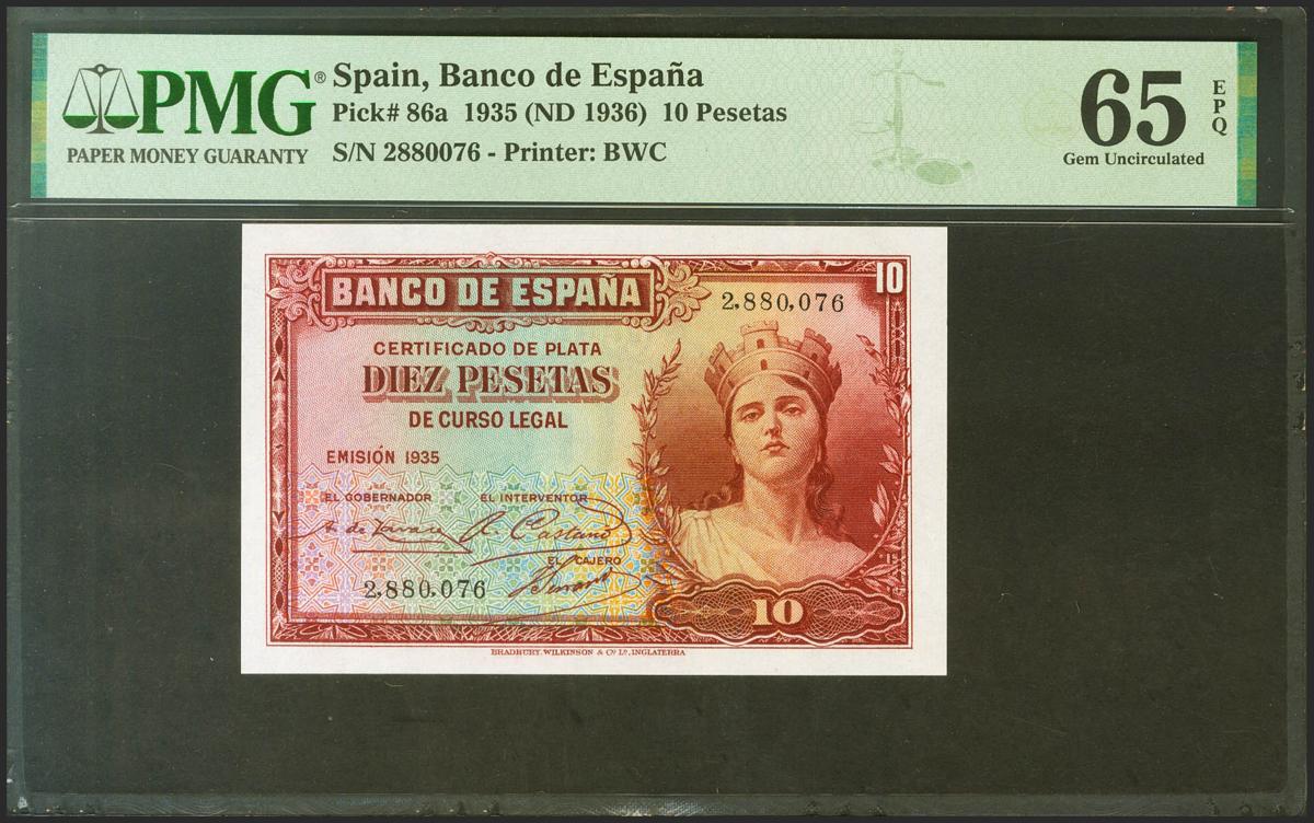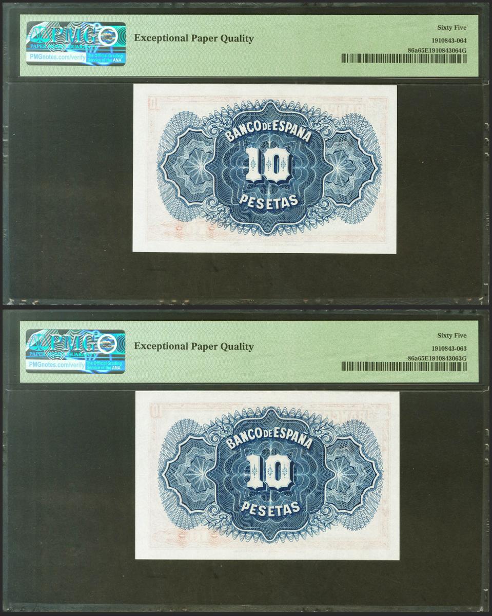 10 Pesetas. 1935. Certificado de Plata. Pareja correlativa. Sin serie. (Edifil 2021: 364, Pick: 86a). Rarísimo en esta calidad, apresto original. SC. Encapsulados PMG65EPQ, ambos.
