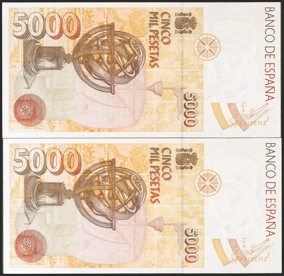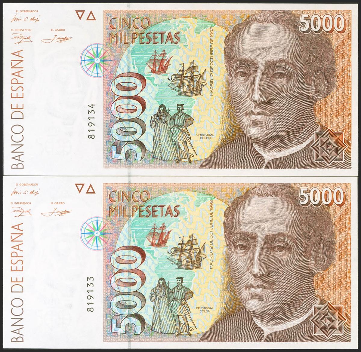 5000 Pesetas. 12 de Octubre de 1992. Pareja correlativa. Sin serie. (Edifil 2021: 484). SC.