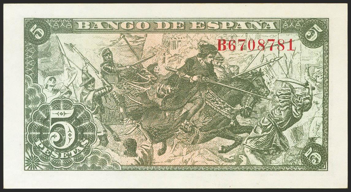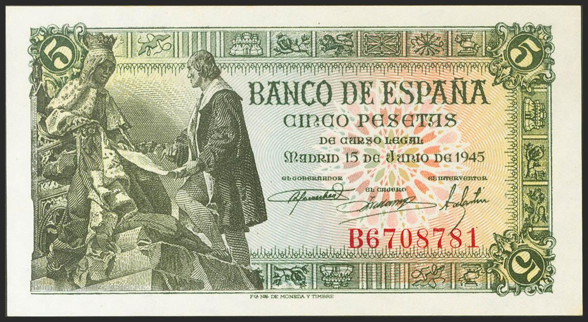 5 Pesetas. 15 de Junio de 1945. Serie B. (Edifil 2021: 449a). Apresto original. SC