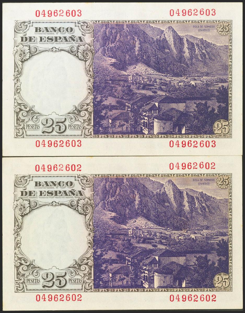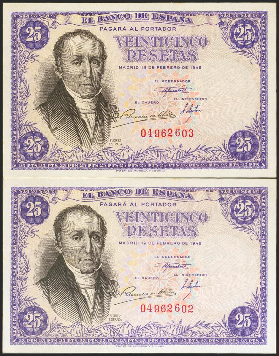 25 Pesetas. 19 de Febrero de 1949. Pareja correlativa. Sin serie. (Edifil 2021: 450). Inusual, conservando parte de su apresto original. EBC.