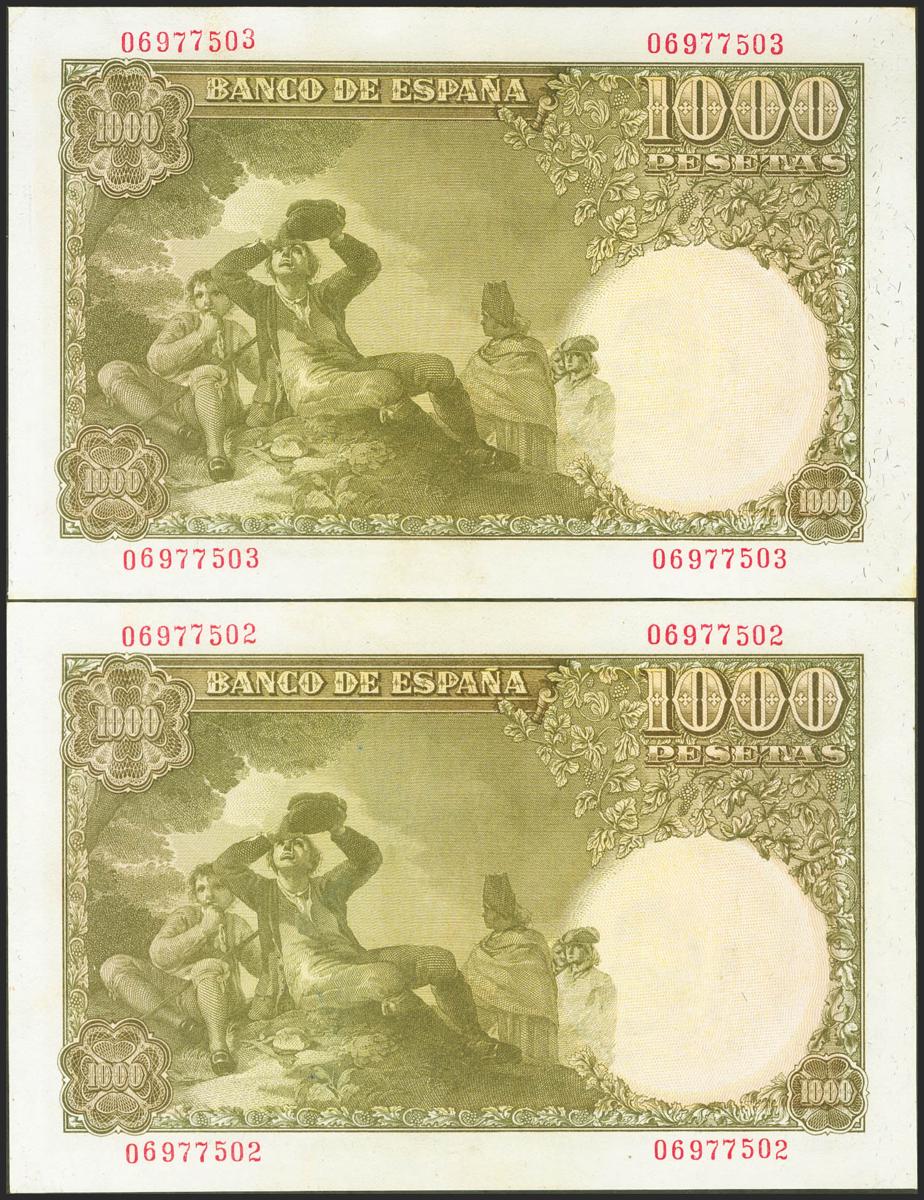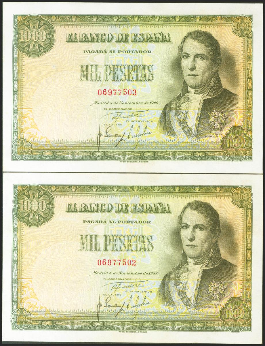 1000 Pesetas. 4 de Noviembre de 1949. Pareja correlativa. Sin serie. (Edifil 2021: 458). Inusual, conserva parte de su apresto original. EBC+.