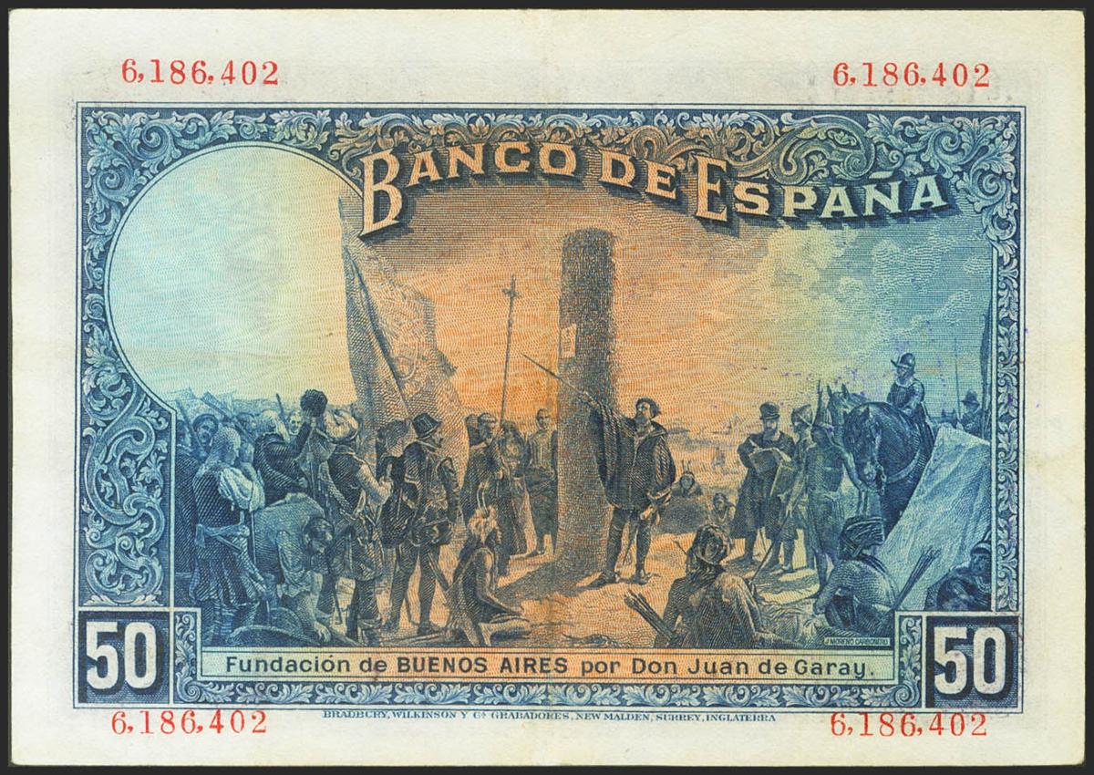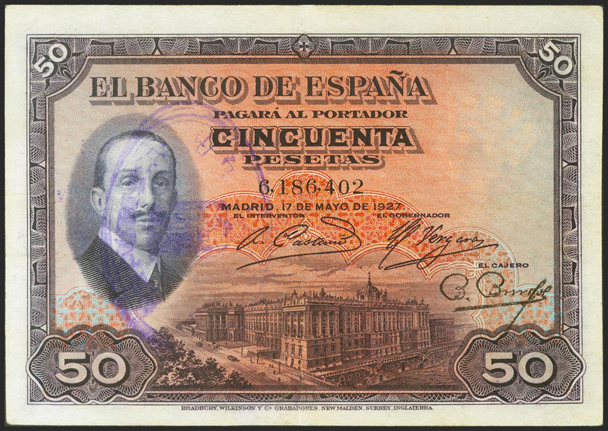 50 Pesetas. 17 de Mayo de 1927. Sin serie y sello de caucho REPUBLICA / ESPAÑOLA. (Edifil 2021: 332, Pick: 80). Mínima reparación. MBC+.
