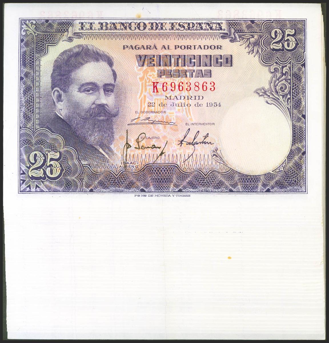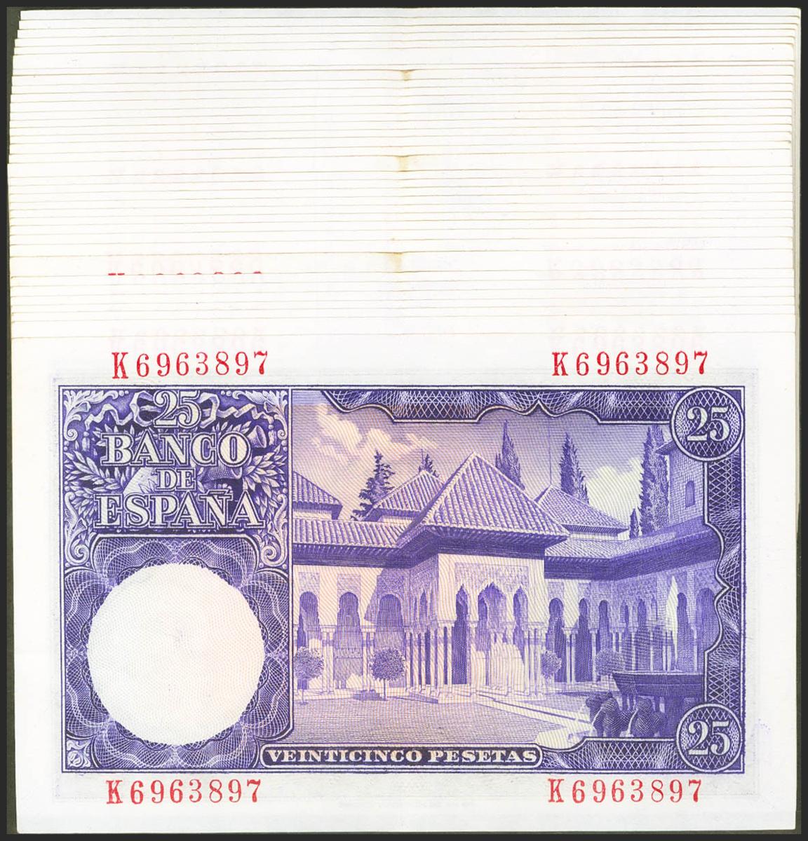 Conjunto de 34 billetes correlativos de 25 Pesetas emitidos el 22 de Julio de 1953 con la serie K (Edifil 2021: 467a), conservando parte de su apresto original,. EBC++.