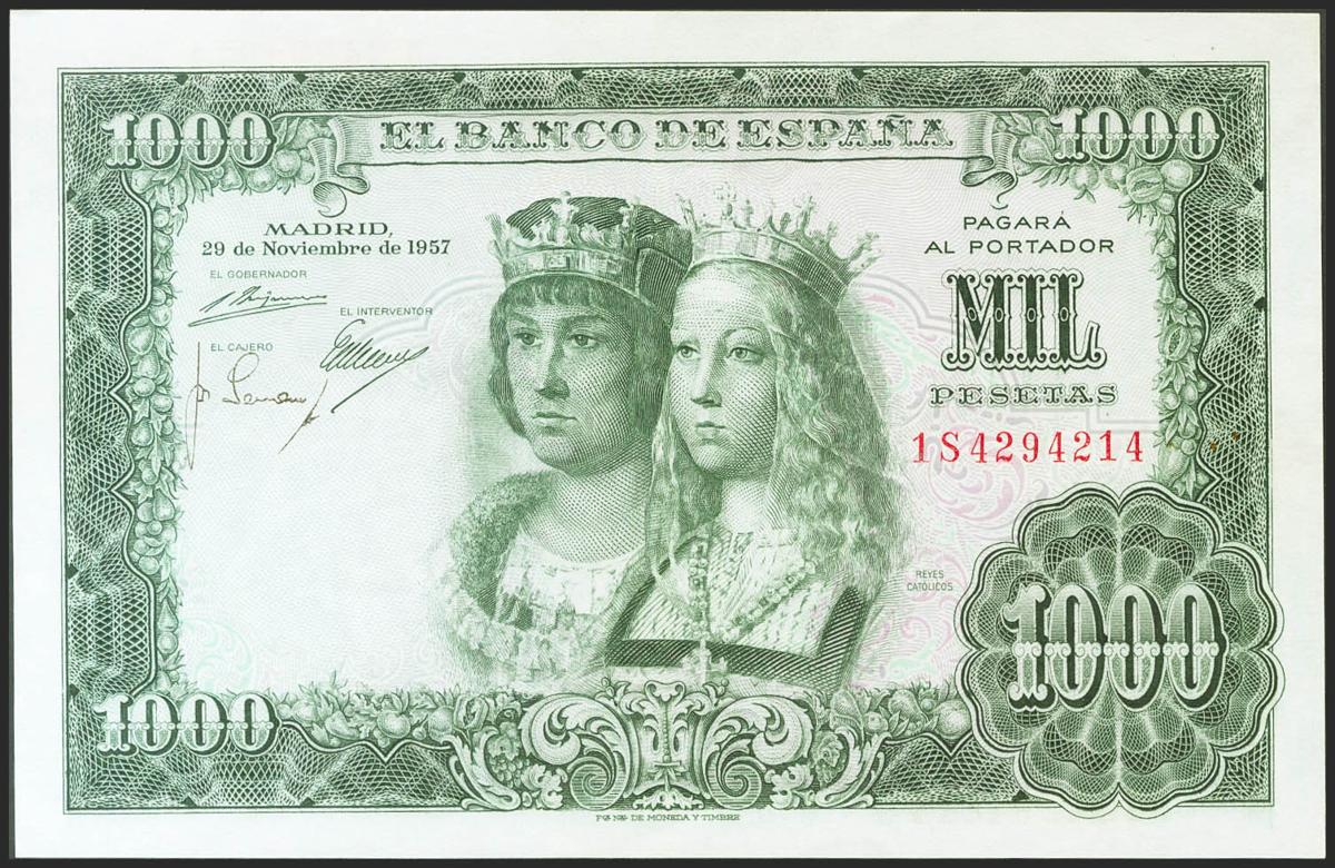 1000 Pesetas. 29 de Noviembre de 1957. Serie 1S. (Edifil 2021: 469b). Conserva todo su apresto original. EBC++.