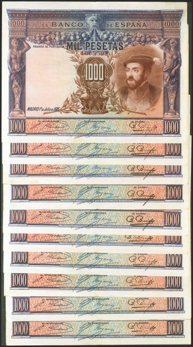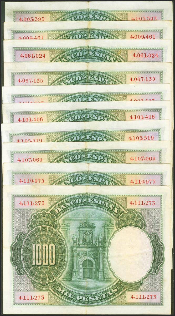 Conjunto de 10 billetes de 1000 Pesetas de la emisión del 1 de Julio de 1925 serie posterior al 3646000 (Edifil 2017: 351). MBC+/MBC.