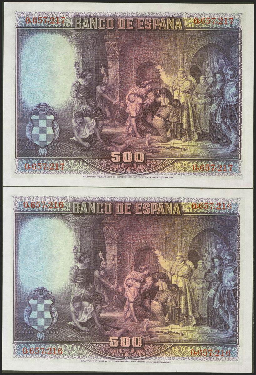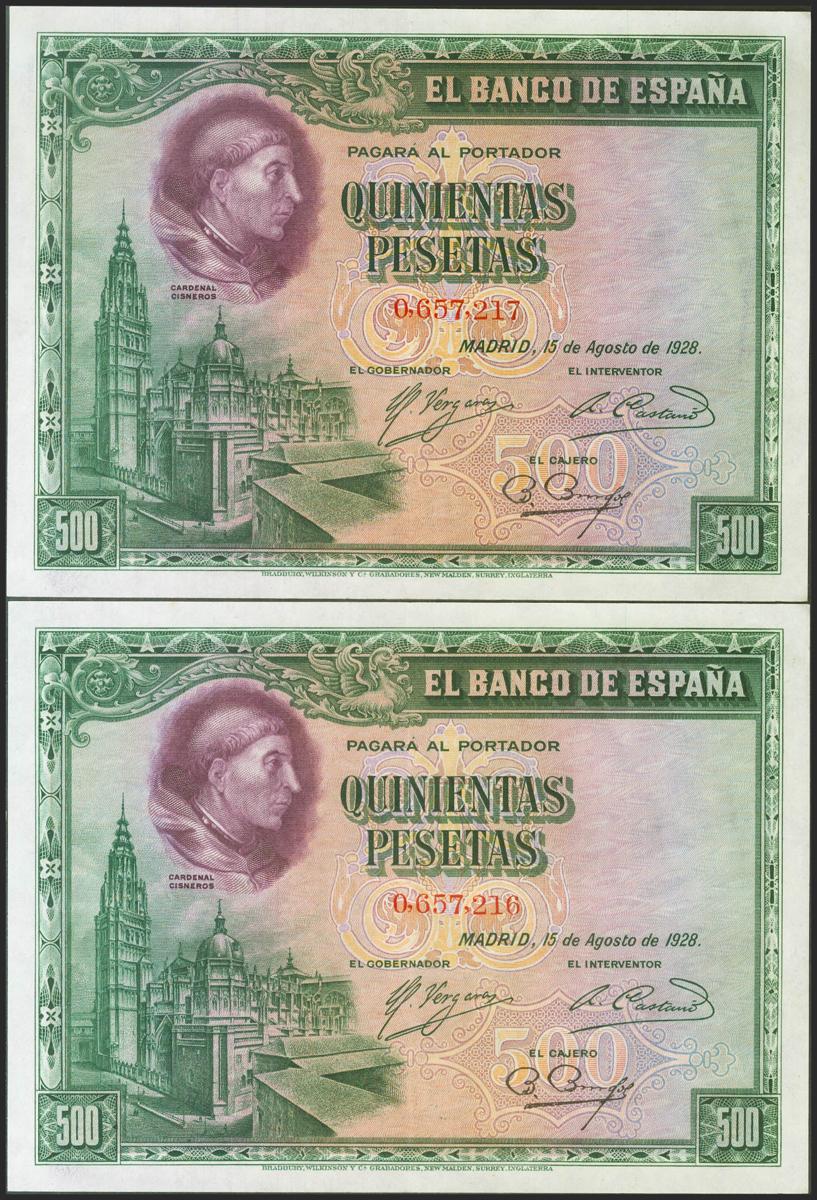 500 Pesetas. 15 de Agosto de 1928. Pareja correlativa. Sin serie. (Edifil 2021: 356, Pick: 77a). Conserva gran parte de su apresto original. EBC+.