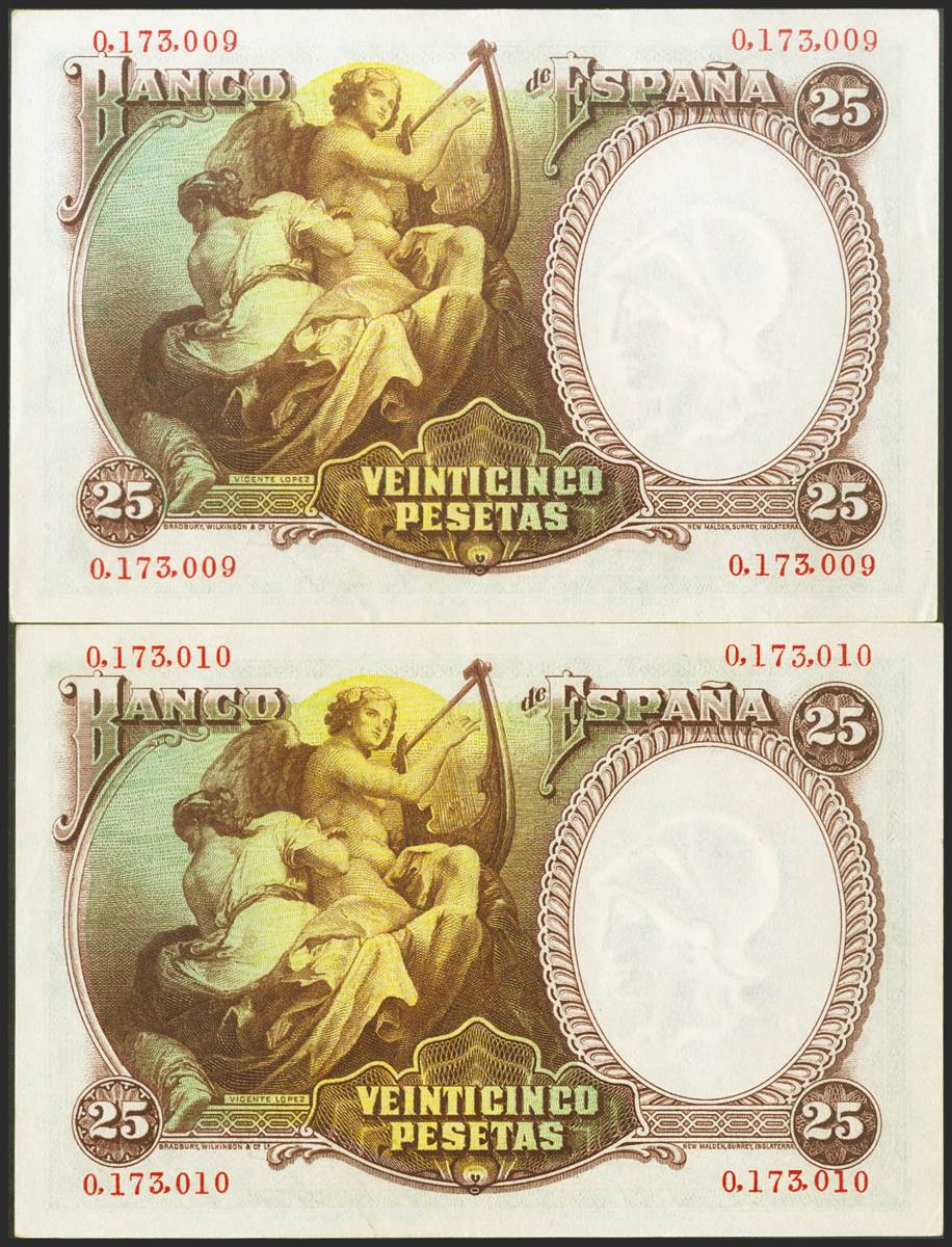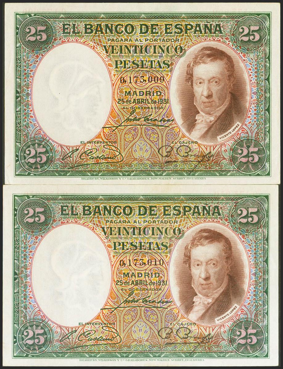 25 Pesetas. 25 de Abril de 1931. Pareja correlativa. Sin serie y numeración baja. (Edifil 2021: 358). Conserva parte del apresto original. EBC.
