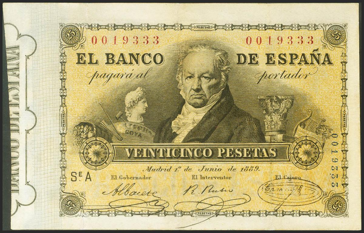 25 Pesetas. 1 de Junio de 1889. Serie A. (Edifil 2021: 297, Pick: 39). Inusual y profesionalmente restaurado, billete con una enorme presencia. MBC.