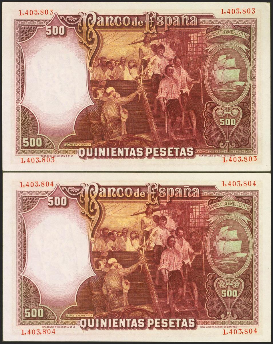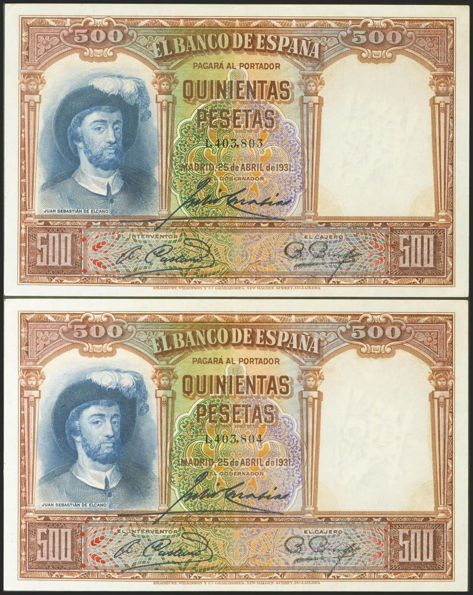 500 Pesetas. 25 de Abril de 1931. Pareja correlativa. Sin serie. (Edifil 2017: 361). Conserva parte de su apresto original. EBC.
