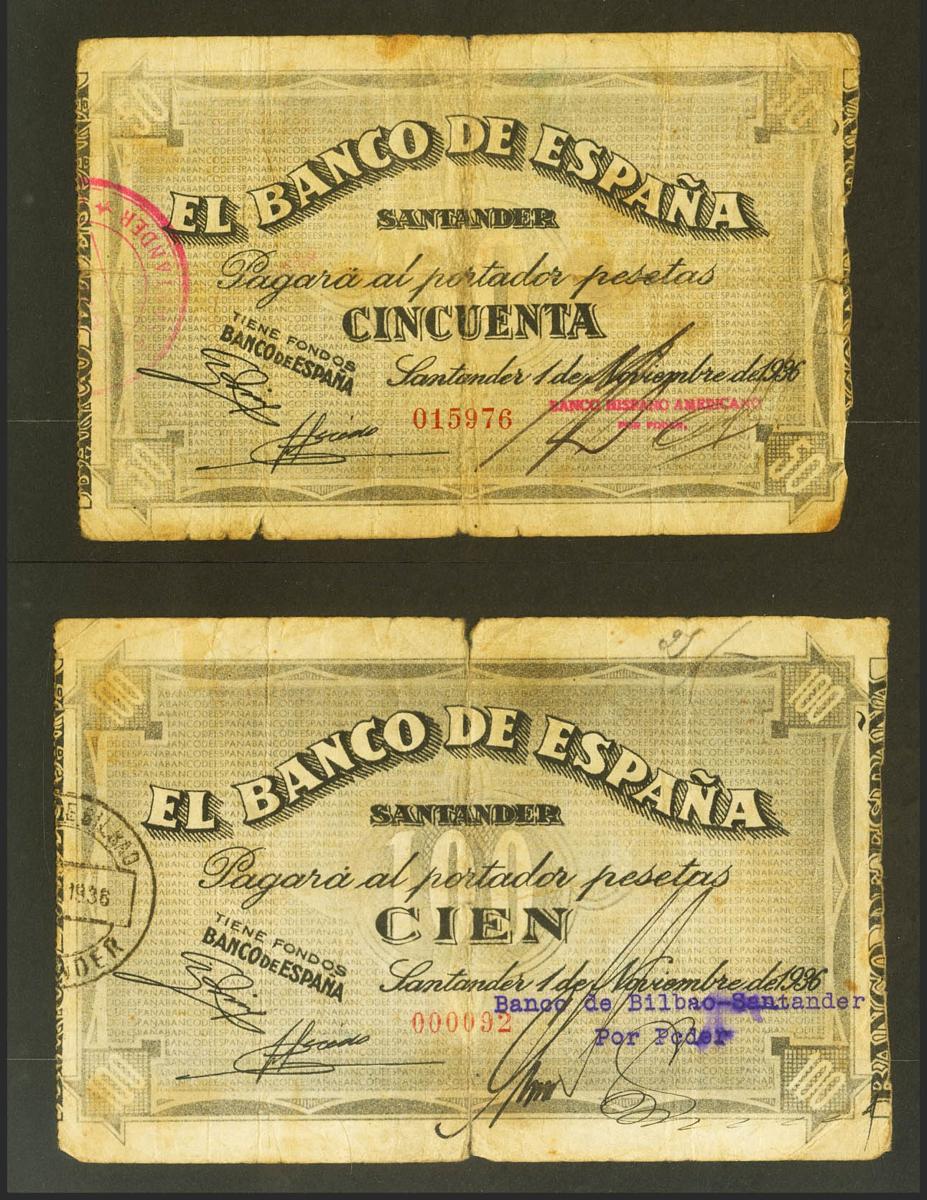 Serie de 5 billetes del Banco de España de la sucursal de Santander correspondientes a los valores de 5 Pesetas (antefirma Banco Mercantil), 10 Pesetas (antefirma ilegible), 25 Pesetas (antefirma del Banco Hispano Americano), 50 Pesetas (antefirma del Banco Hispano Americano) y 100 Pesetas (antefirma Banco de Bilbao-Santander y con numeración bajísima), emitidos el 1 de Noviembre de 1936. (Edifil 2021: 375f, 376, 377c, 378c, 379a). Inusual conjunto. BC+/RC+.
