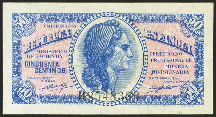 50 Céntimos. 1937. Ministerio de Hacienda. Serie B. (Edifil 2021: 391). Apresto original. SC.