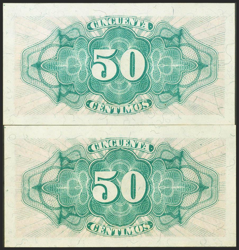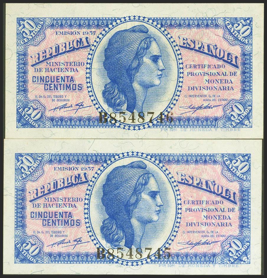50 Céntimos. 1937. Ministerio de Hacienda. Pareja correlativa. Serie B. (Edifil 2021: 391). Apresto original. SC.