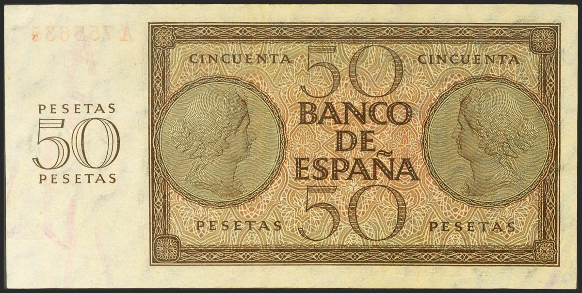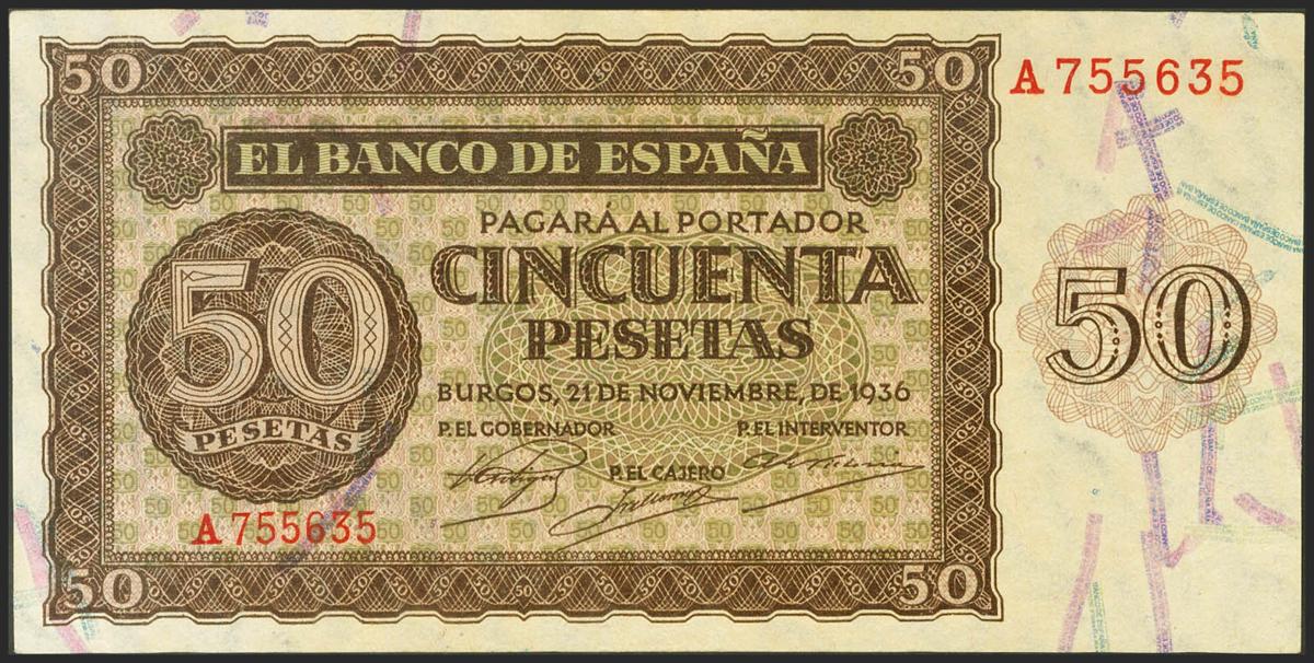 50 Pesetas. 21 de Noviembre de 1936. Serie A. (Edifil 2021: 420). Conserva parte de su apresto original. EBC+.