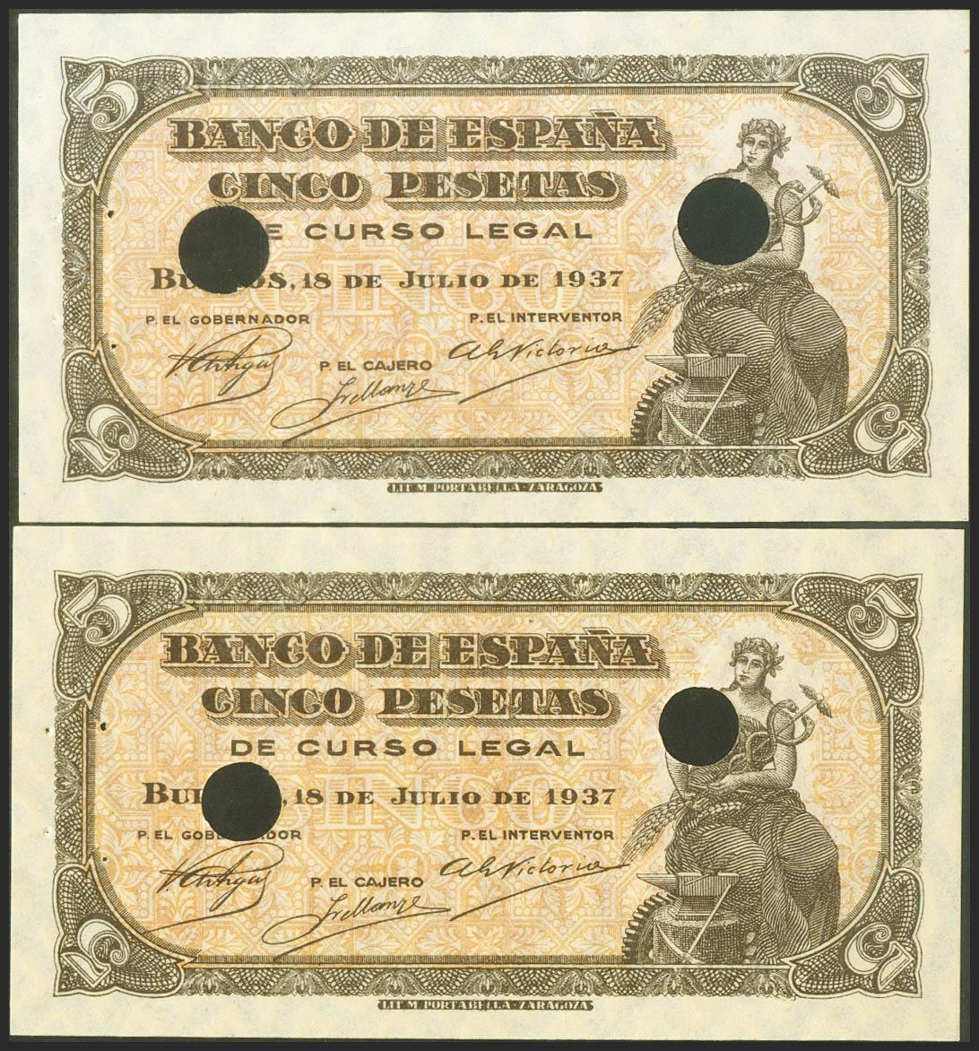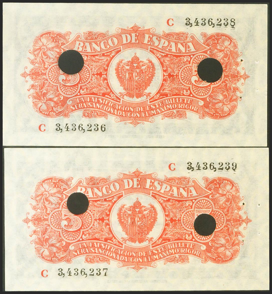5 Pesetas. 18 de Junio de 1937. Pareja correlativa. Serie C, última serie emitida, error en la numeración al dorso que presenta un salto en el dígito de la centena en ambos billetes. Taladrados y con puntitos de grapa. (Edifil 2017: 424a). Rara, apresto original. SC-.