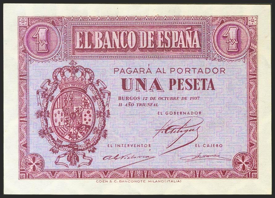 1 Peseta. 12 de Octubre de 1937. Serie D. (Edifil 2021: 425a). Inusual, apresto original. SC.