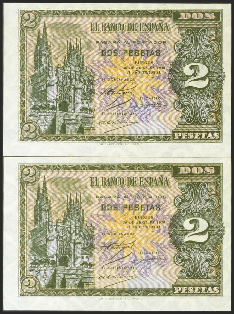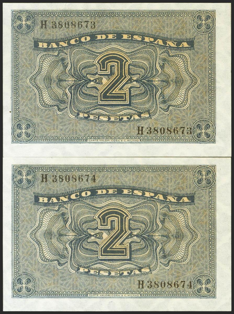 2 Pesetas. 30 de Abril de 1938. Pareja correlativa. Serie H. (Edifil 2021: 429a). Conserva todo su apresto original. SC.