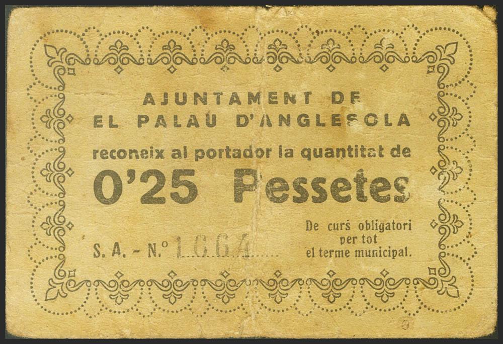 PALAU DE ANGLESOLA (LERIDA). 25 Céntimos. (1937ca). (González: 9110). Rarísimo. MBC.