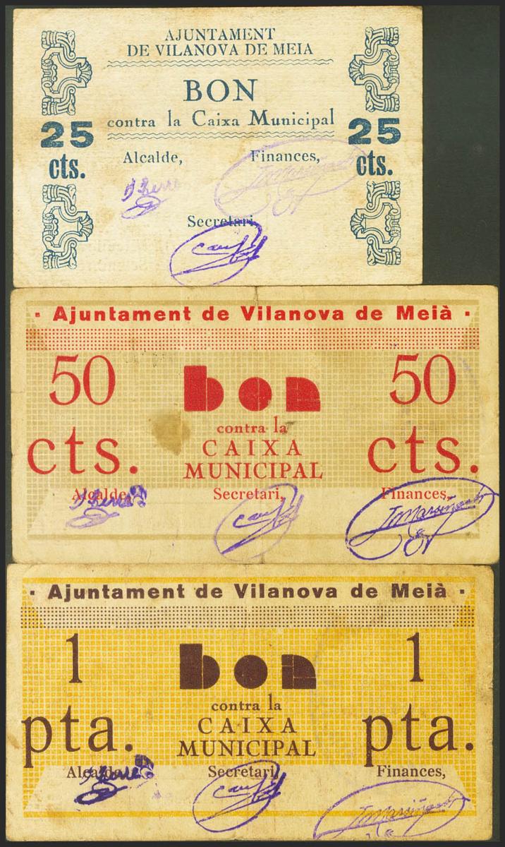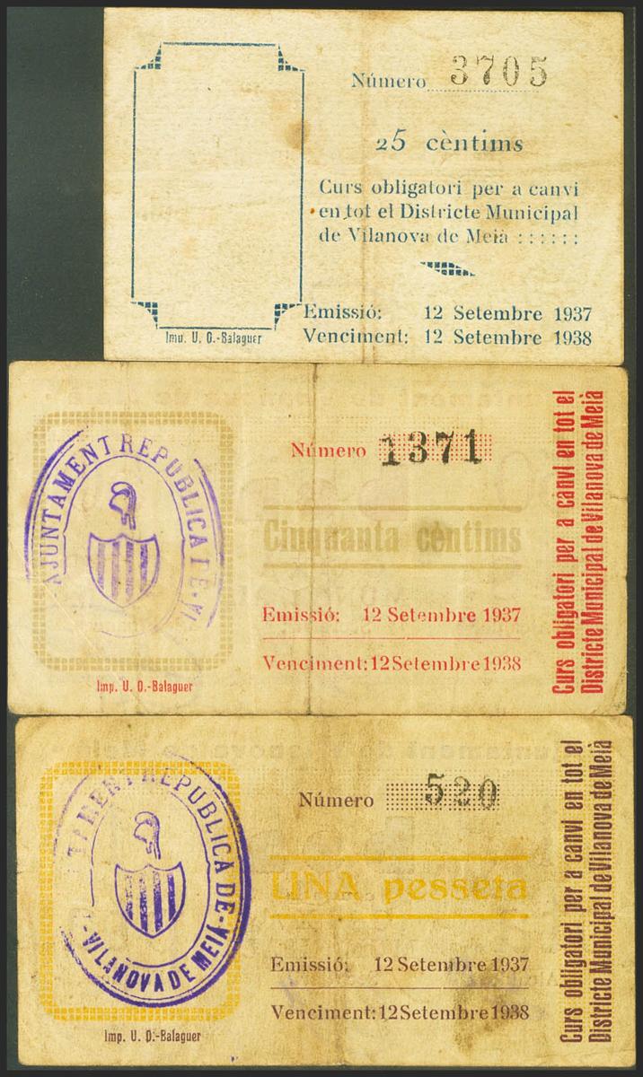 VILANOVA DE MEIA (LERIDA). 25 Céntimos, 50 Céntimos y 1 Peseta. 12 de Septiembre de 1937. (González: 10815/17). Rara serie completa. MBC.