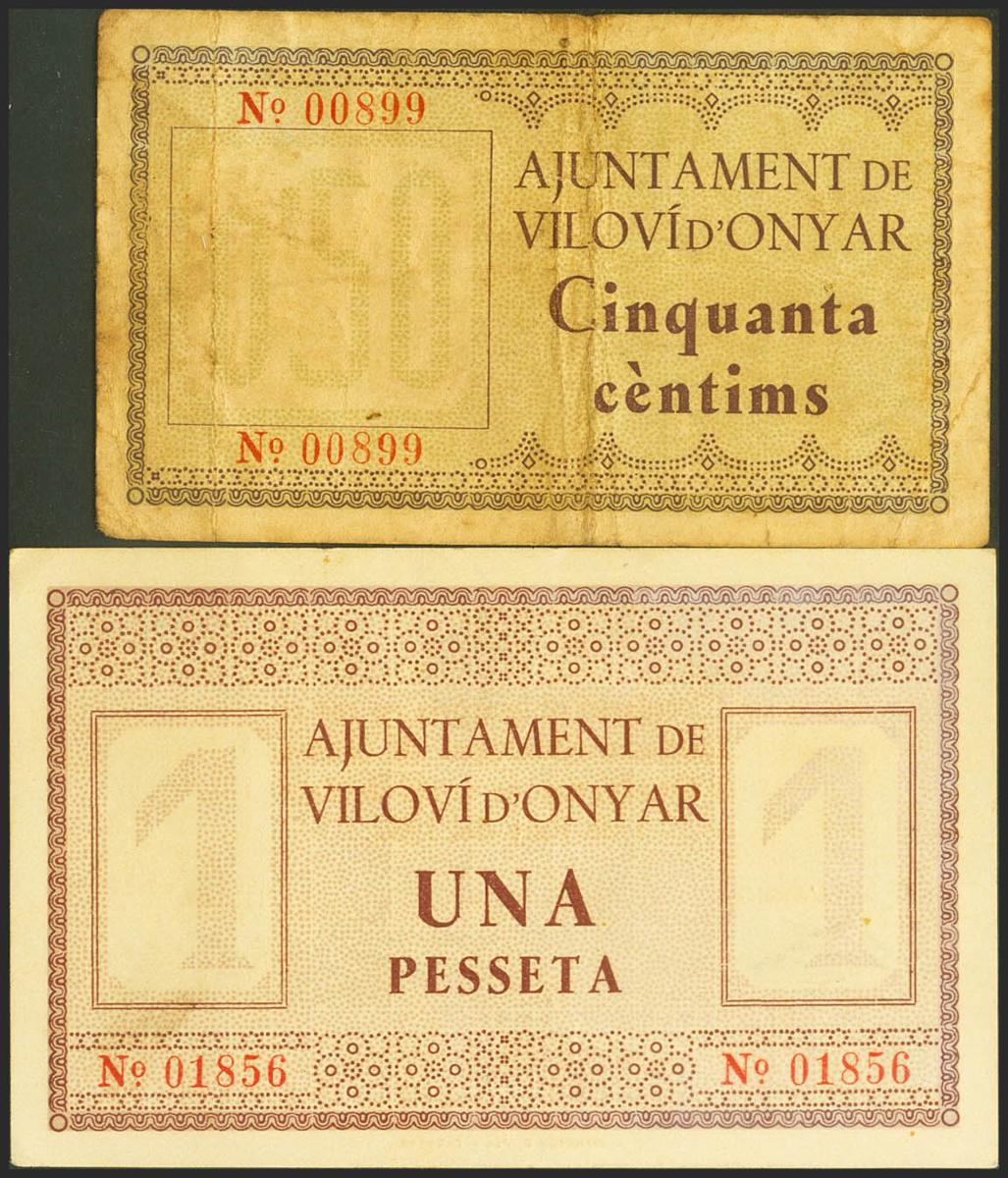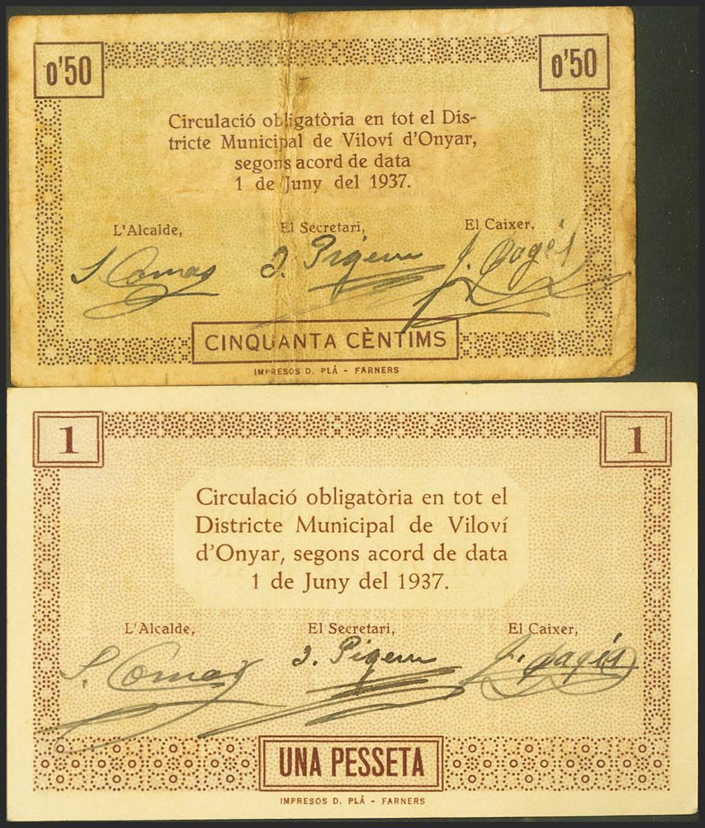 VILOVI DE ONYAR (GERONA). 50 Céntimos y 1 Peseta. 1 de Julio de 1937. (González: 10903/04). Rara serie completa. MBC/SC.