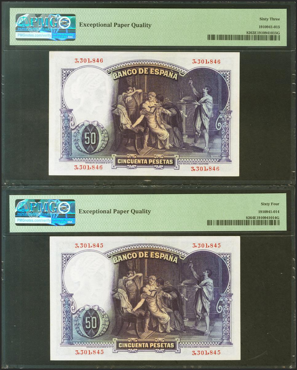 50 Pesetas. 25 de Abril de 1931. Pareja correlativa. Sin serie. (Edifil 2021: 359, Pick: 82). Rarísima con apresto original. SC. Encapsulado PMG64EPQ/63EPQ.