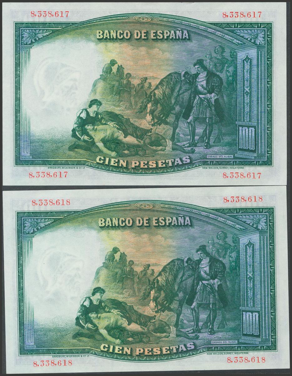 100 Pesetas. 25 de Abril de 1931. Pareja correlativa. Sin serie. (Edifil 2017: 360). Conserva todo su apresto original. SC-.
