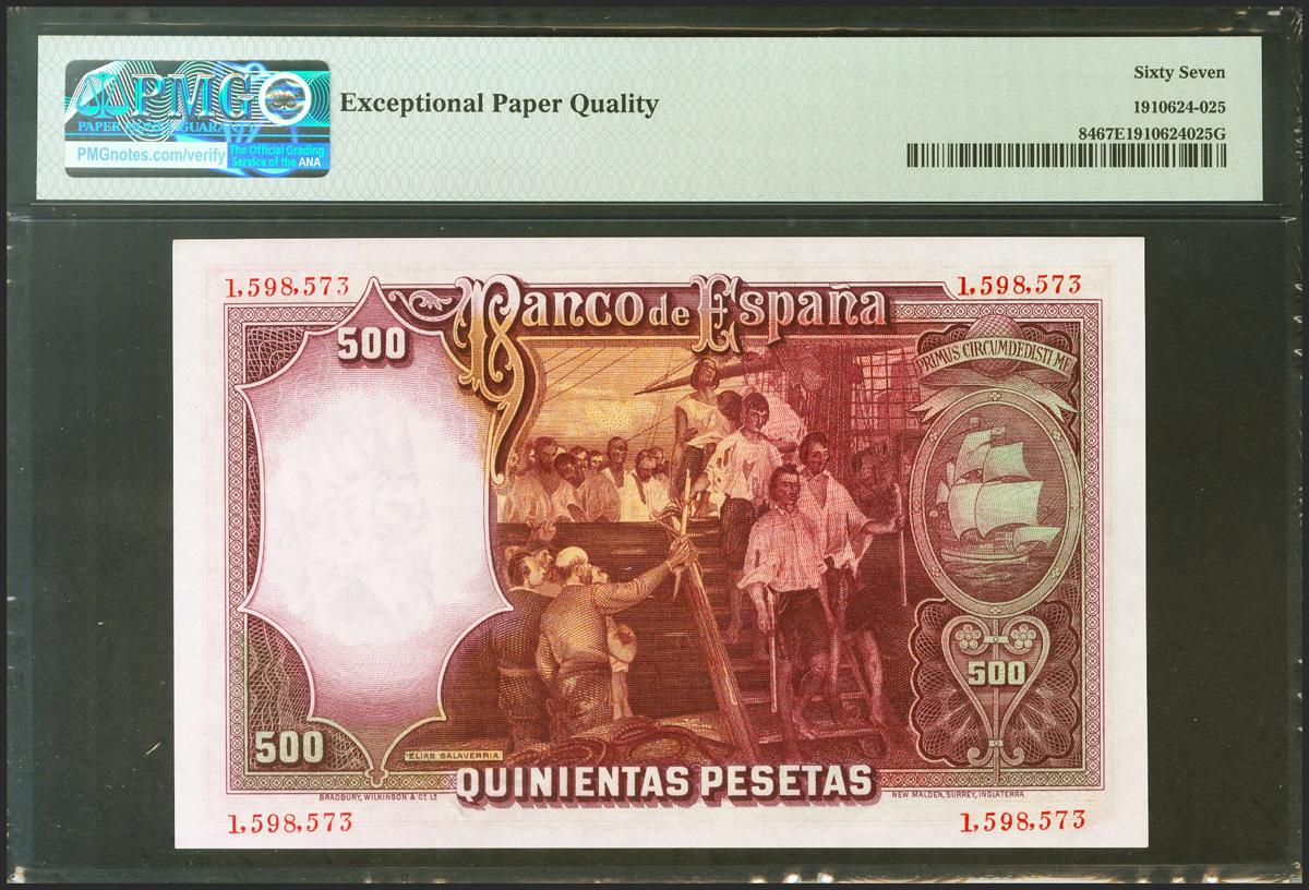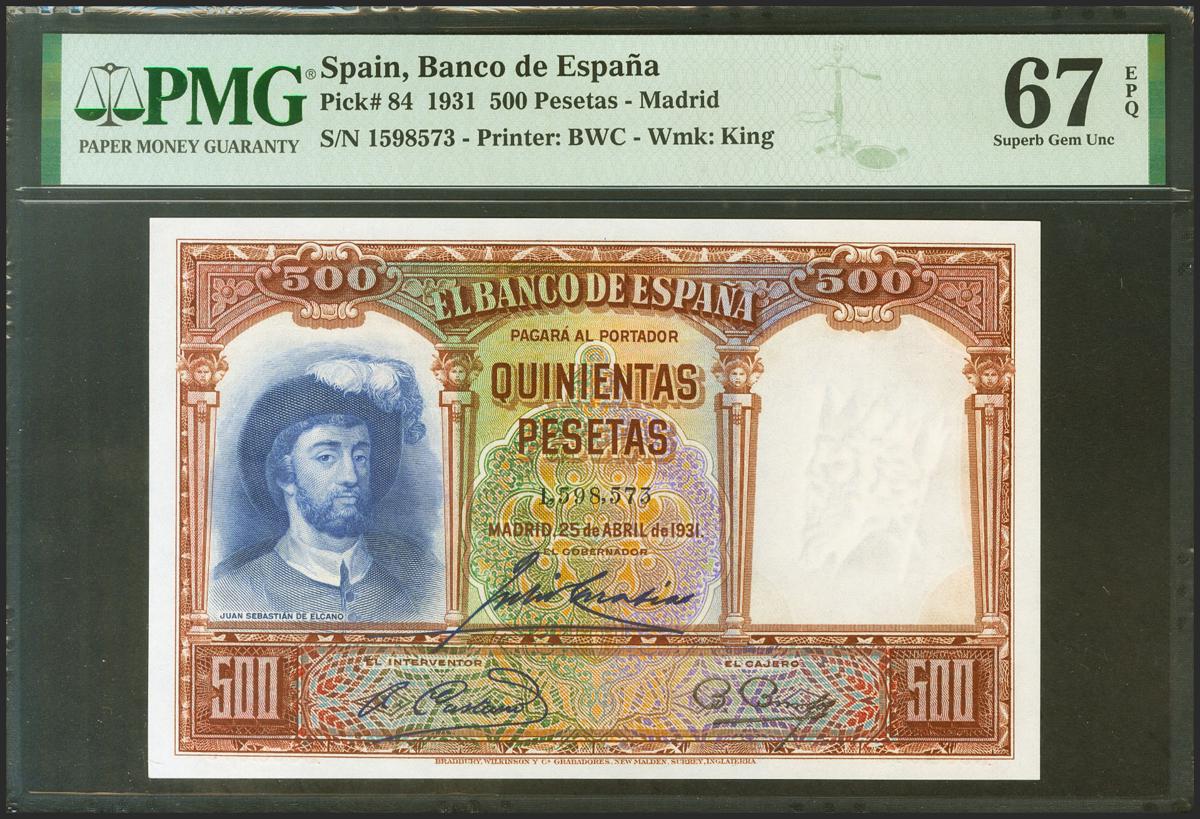 500 Pesetas. 25 de Abril de 1931. Sin serie. (Edifil 2021: 361, Pick: 84). Rarísimo en esta excepcional calidad, apresto original. SC. Encapsulado PMG67EPQ.