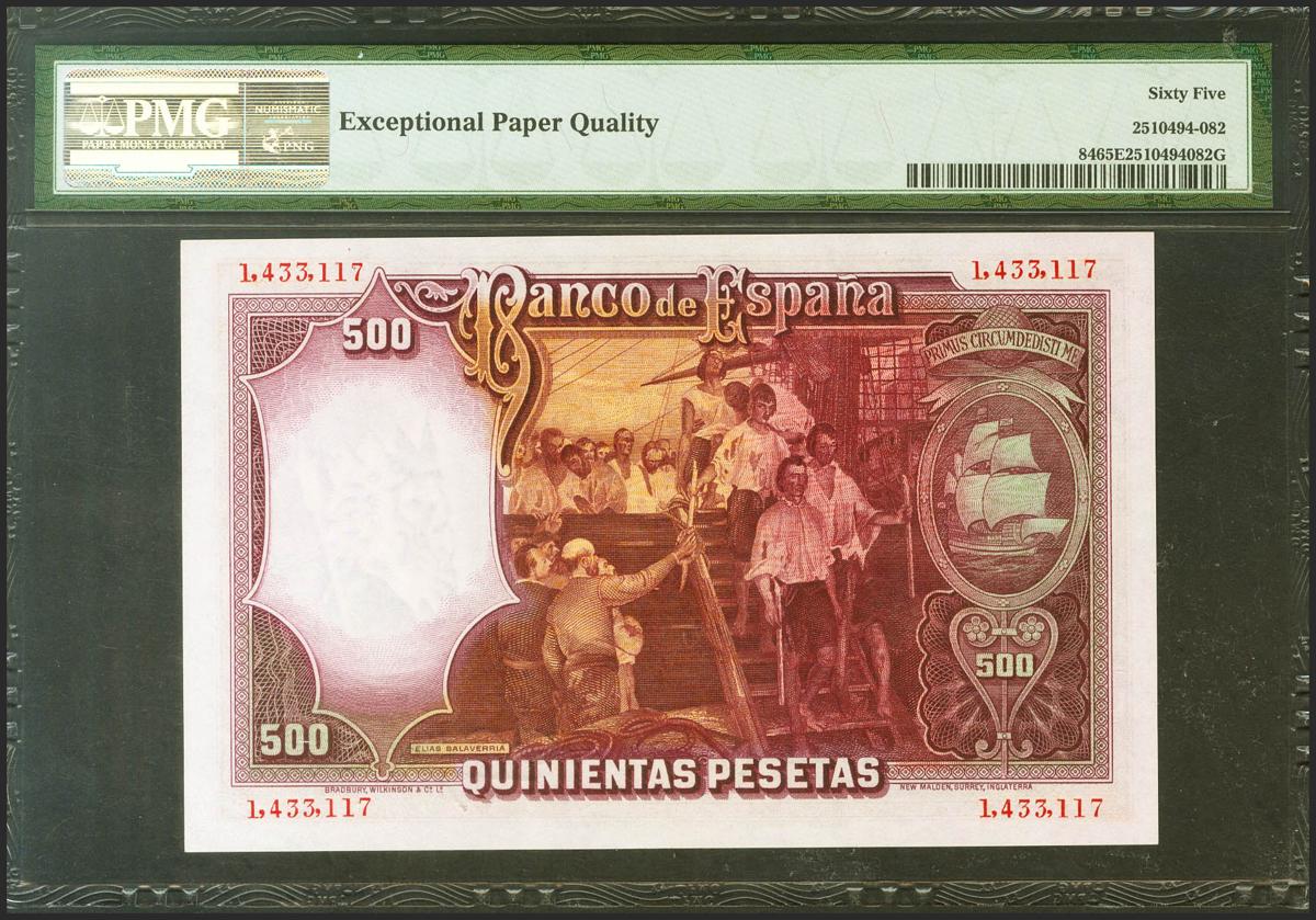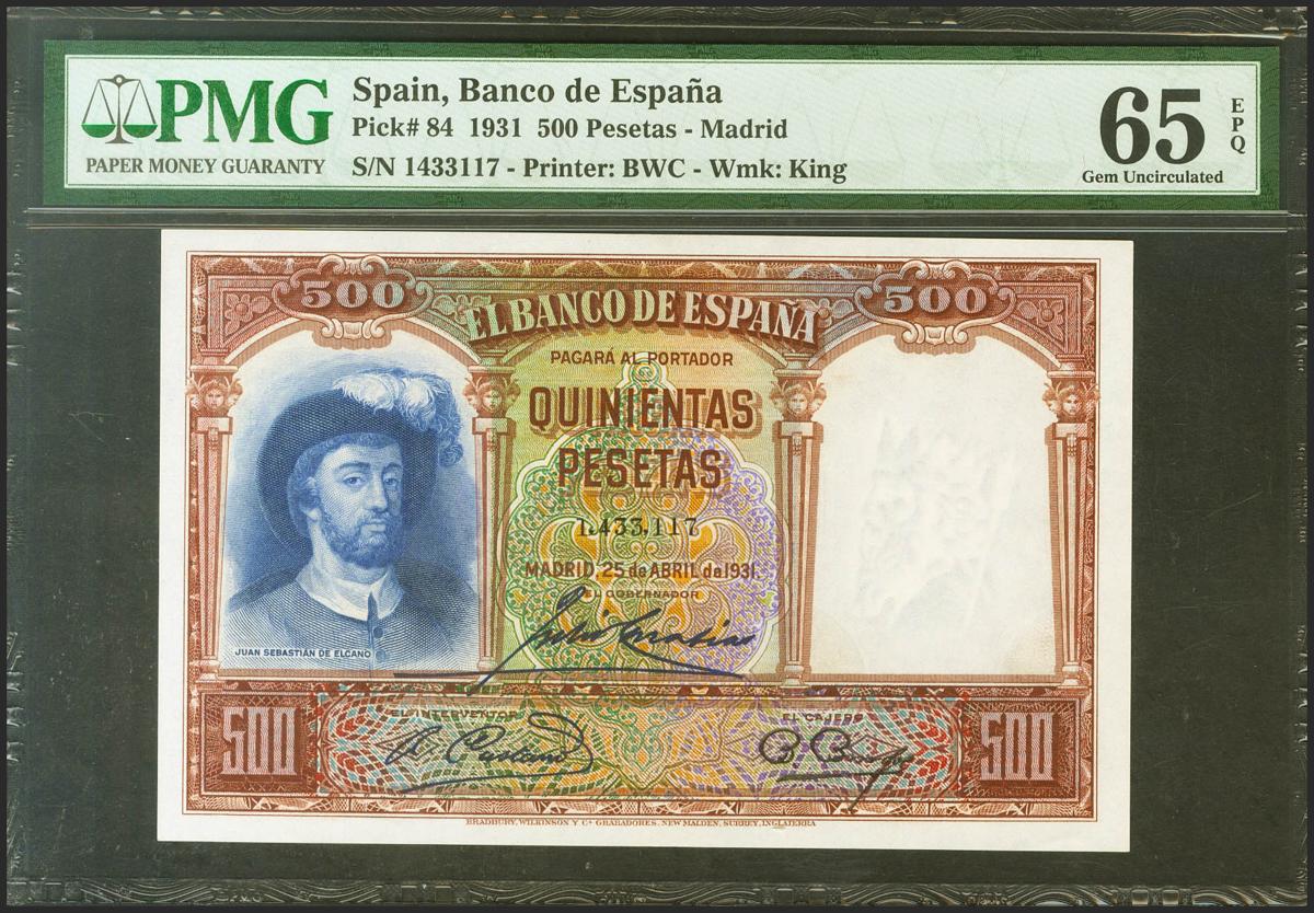 500 Pesetas. 25 de Abril de 1931. Sin serie. (Edifil 2021: 361, Pick: 84). Inusual en esta excepcional calidad, apresto original. SC. PMG65EPQ.