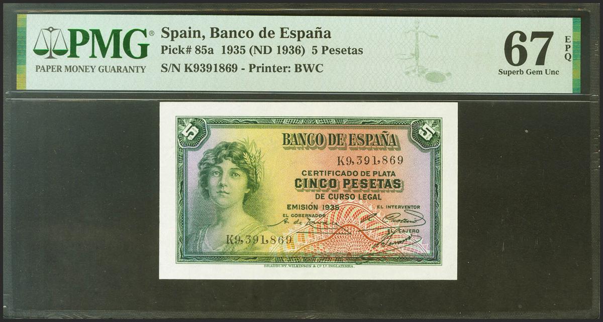 5 Pesetas. 1935. Certificado de Plata. Serie K. (Edifil 2021: 363b, Pick: 85a). Raro en esta excepcional calidad, apresto original. SC. Encapsulado PMG67EPQ.