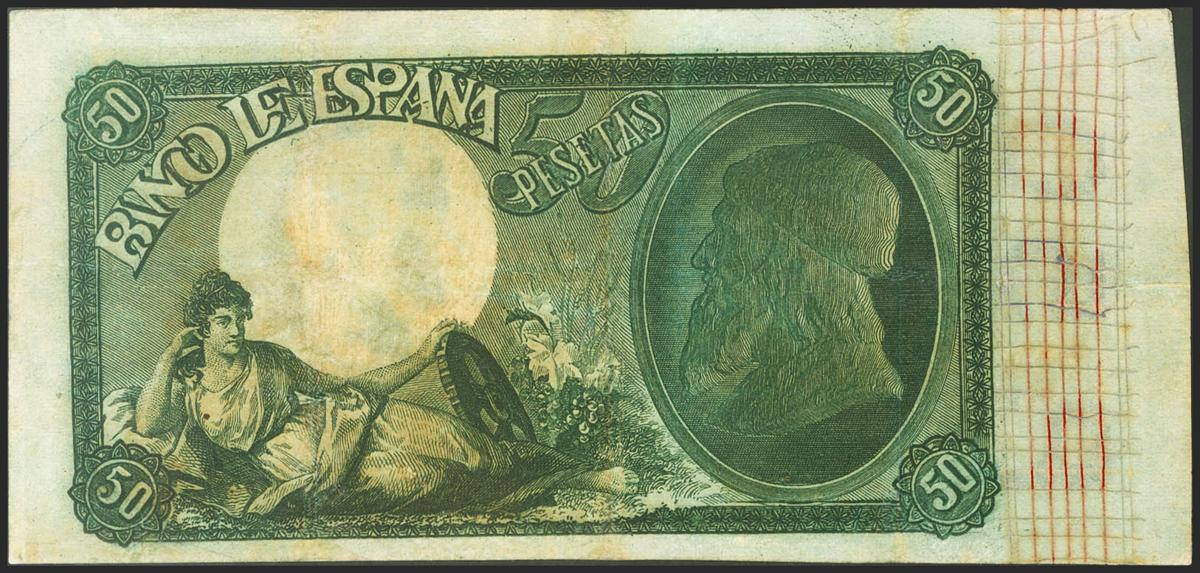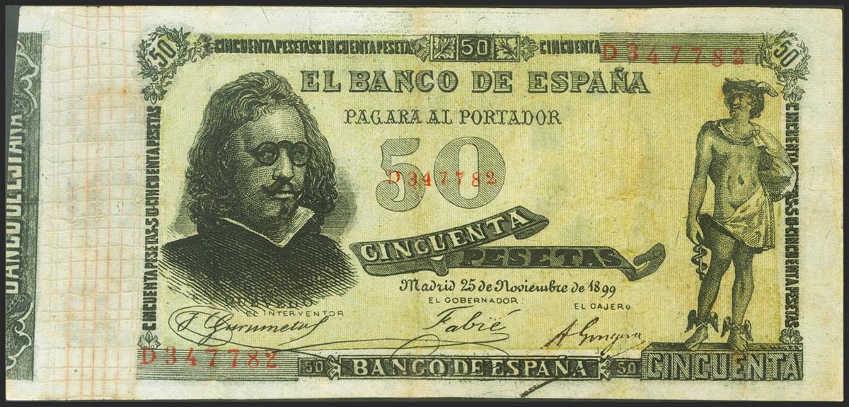 50 Pesetas. 25 de Noviembre de 1899. Falso de época. Serie A. (Edifil 2021: 307F). Muy raro, reparado. MBC-.