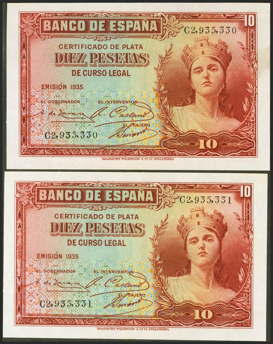 10 Pesetas. 1935. Pareja correlativa. Certificado de Plata. Serie B. (Edifil 2021: 364a). Apresto original. EBC+.