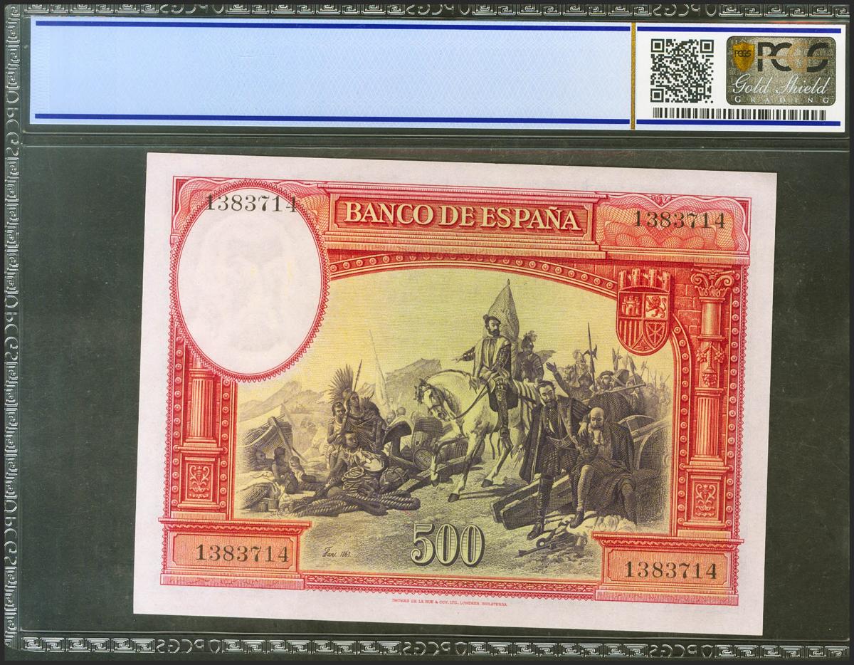 500 Pesetas. 7 de Enero de 1935. Sin serie. (Edifil 2021: 365, Pick: 89). Inusual en esta excepcional calidad, apresto original. SC. Encapsulado PCGS67OPQ.