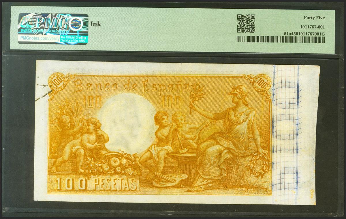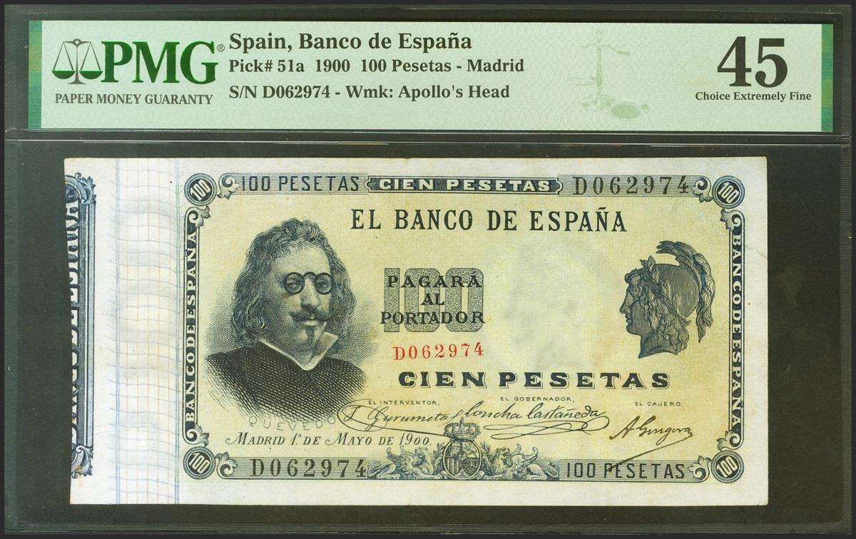 100 Pesetas. 1 de Mayo de 1900. Serie D. (Edifil 2021: 308a, Pick: 51a). Rarísimo, especialmente en esta excepcional calidad. EBC-. Encapsulado PMG45 (ink).