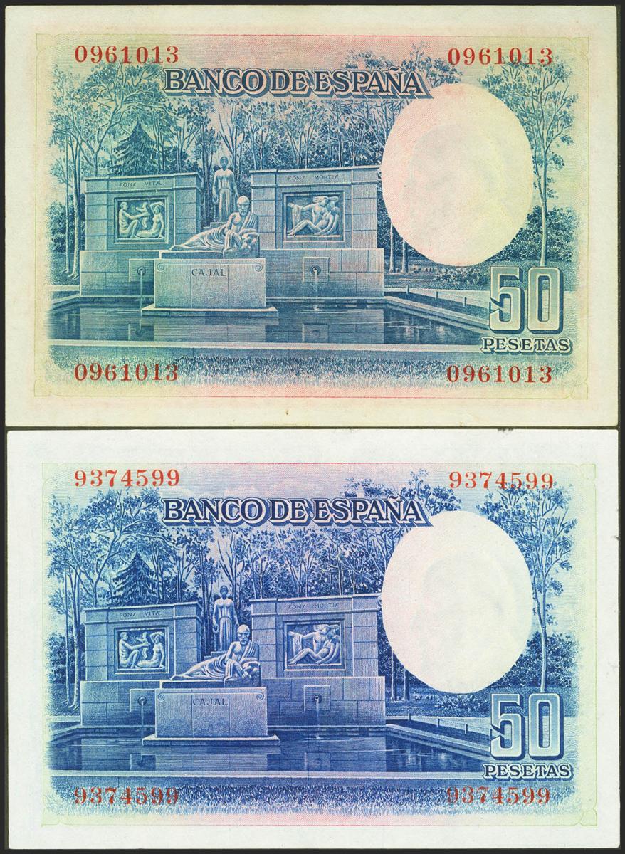 Conjunto de 2 billetes de 50 Pesetas emitidos el 22 de Julio de 1935 y sin serie, ambos alterados químicamente. (Edifil 2021: 366). MBC+.